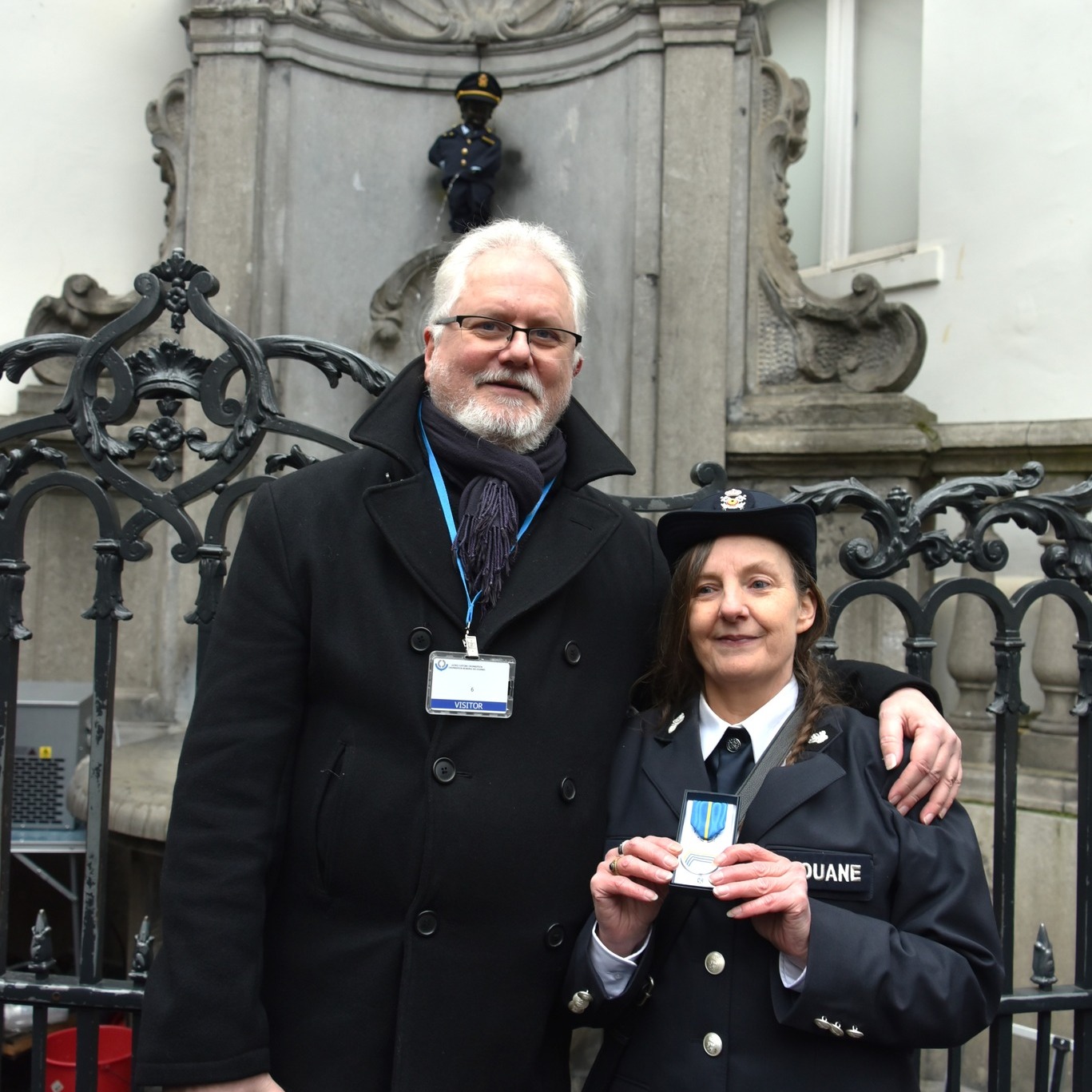 Uit handen van administrateur-generaal Kristian Vanderwaeren ontving zij een welverdiende medaille, gevolgd door een heerlijke lunch. Ook onze conservator was er als de kippen bij om Peggy te feliciteren, onder het goedkeurend oog van gelegenheidsdouanier Manneken Pis.