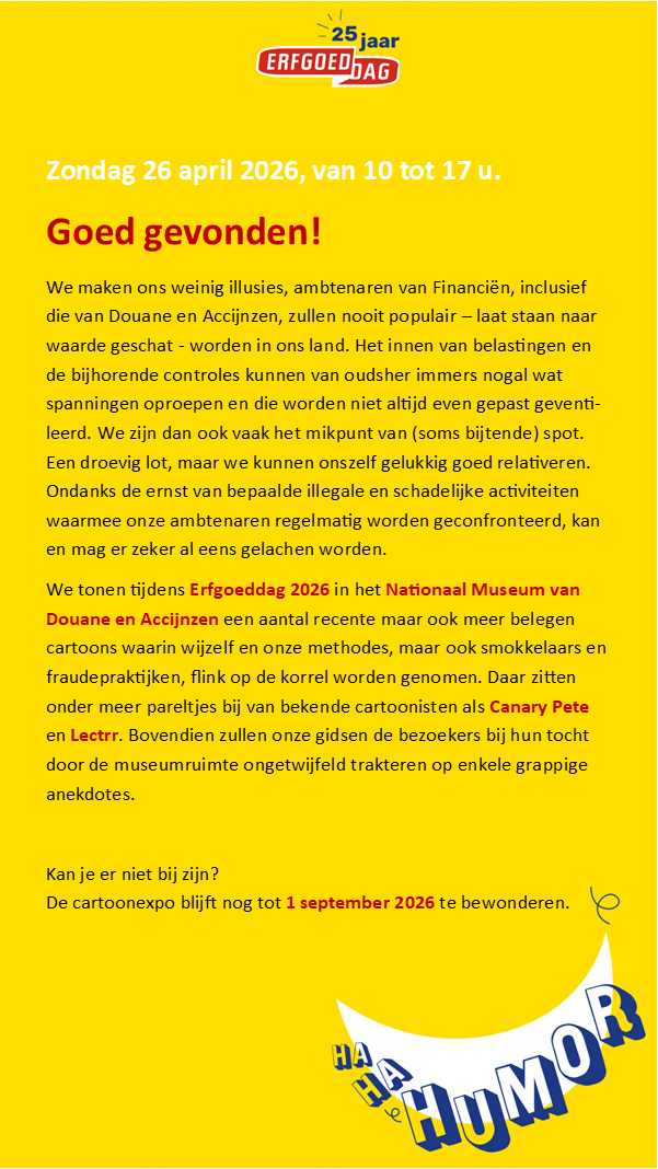 Nog tot 1 november 2025 kunnen collega’s en oudgedienden van de FOD Financiën onze expo ‘275 jaar Autonome Douanepolitiek’ bezoeken in het OPF Dennenburg (Kapellen).